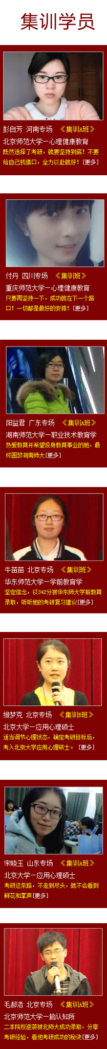 火车跑得快,全凭车头带。作为集中特训班的核心竞争力,师资的配备毫无疑问是最为关键的一环。集训讲师团主要由北大、北师大、中科院、首师大等名校的在读博士、硕士组成。他们在层层的考核中脱颖而出,不仅具有扎实的专业基础,并且充满激情与活力,更重要的是,他们富有名校考研成功的经验与高效的学习策略。